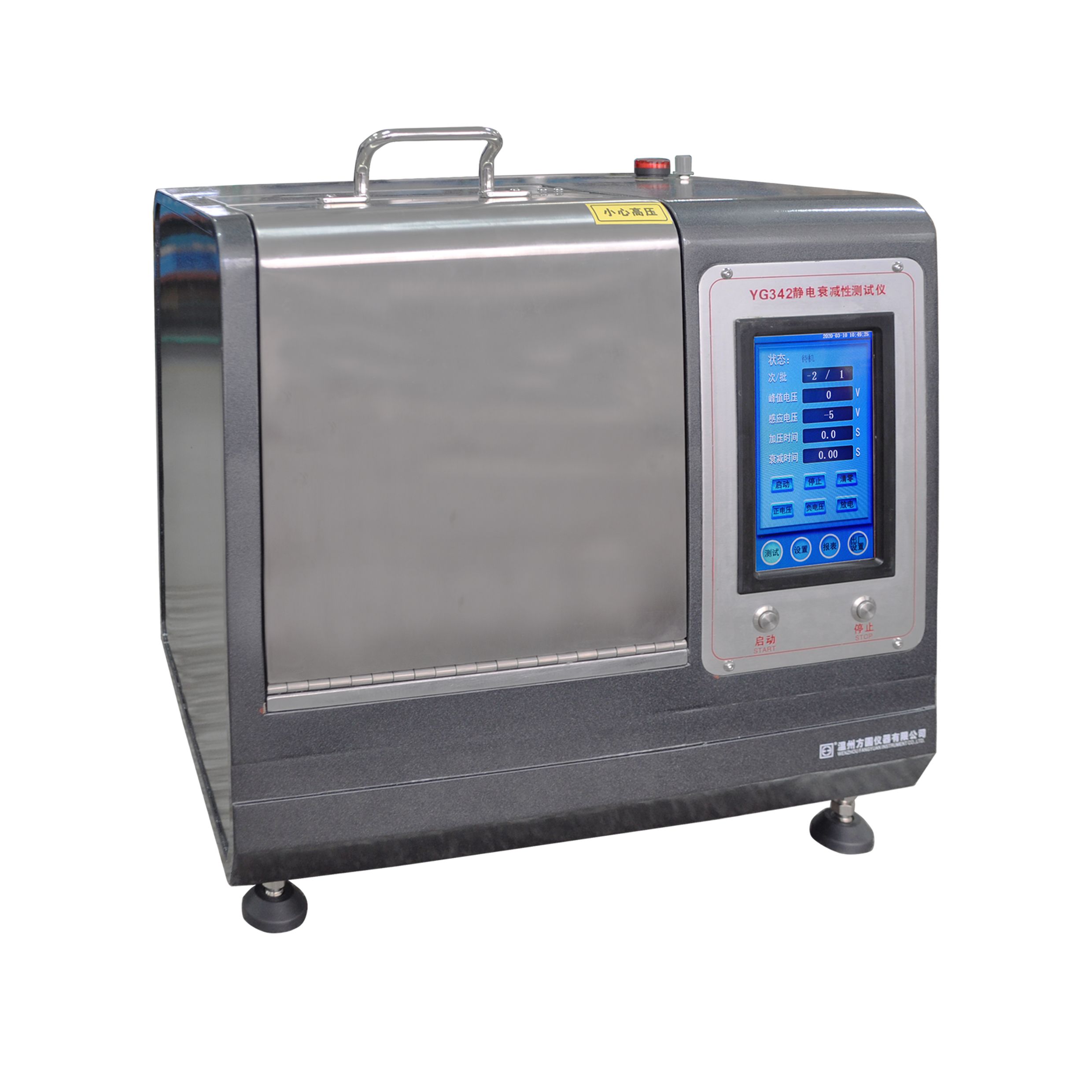 用途:用于測試醫(yī)用防護服材料和無紡布在施加±5000V電壓作用后停止充電,在接地的時候材料能夠消除誘導(dǎo)到材料表面的電荷的能力,即測定由峰值電壓衰減到10%的靜電衰減時間。