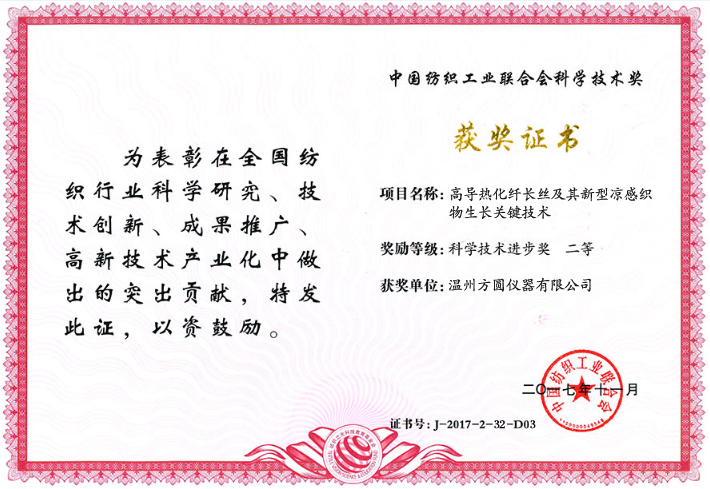 近日,在由中國紡織工業(yè)聯(lián)合會主辦、紡織之光科技教育基金會協(xié)辦的“紡織之光”2017年度中國紡織工業(yè)聯(lián)合會科技教育獎勵大會上,溫州方圓儀器有限公司參評的“紡織品水分蒸發(fā)檢驗儀器研究與開發(fā)”、“高導(dǎo)熱化纖長絲及其新型涼感織物生產(chǎn)關(guān)鍵技術(shù)”雙雙榮獲“科學技術(shù)進步獎二等獎”。